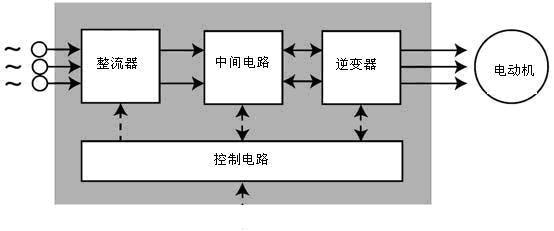 變頻器是把工頻電源(50Hz或60Hz)變換成各種頻率的交流電源,以實現(xiàn)電機的變速運行的設(shè)備。如圖1所示,其中控制電路完成對主電路的控制,整流電路將交流電變換成直流電,直流中間電路對整流電路的輸出進行平滑濾波,逆變電路將直流電再逆變成交流電。對于如矢量控制變頻器這種需要大量運算的變頻器來說,有時還需要一個進行轉(zhuǎn)矩計算的CPU以及一些相應(yīng)的電路。