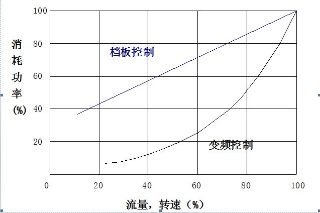 交流驅動系統(tǒng)實際使用時,可通過實測或根據(jù)其靜態(tài)特性的理論計算,作出其轉速對功率的特性曲線,由于轉速與流量成正比,該曲線即流量對功率的特性,如圖1所示。與檔板調節(jié)相比較,可見其節(jié)能是顯著的。
