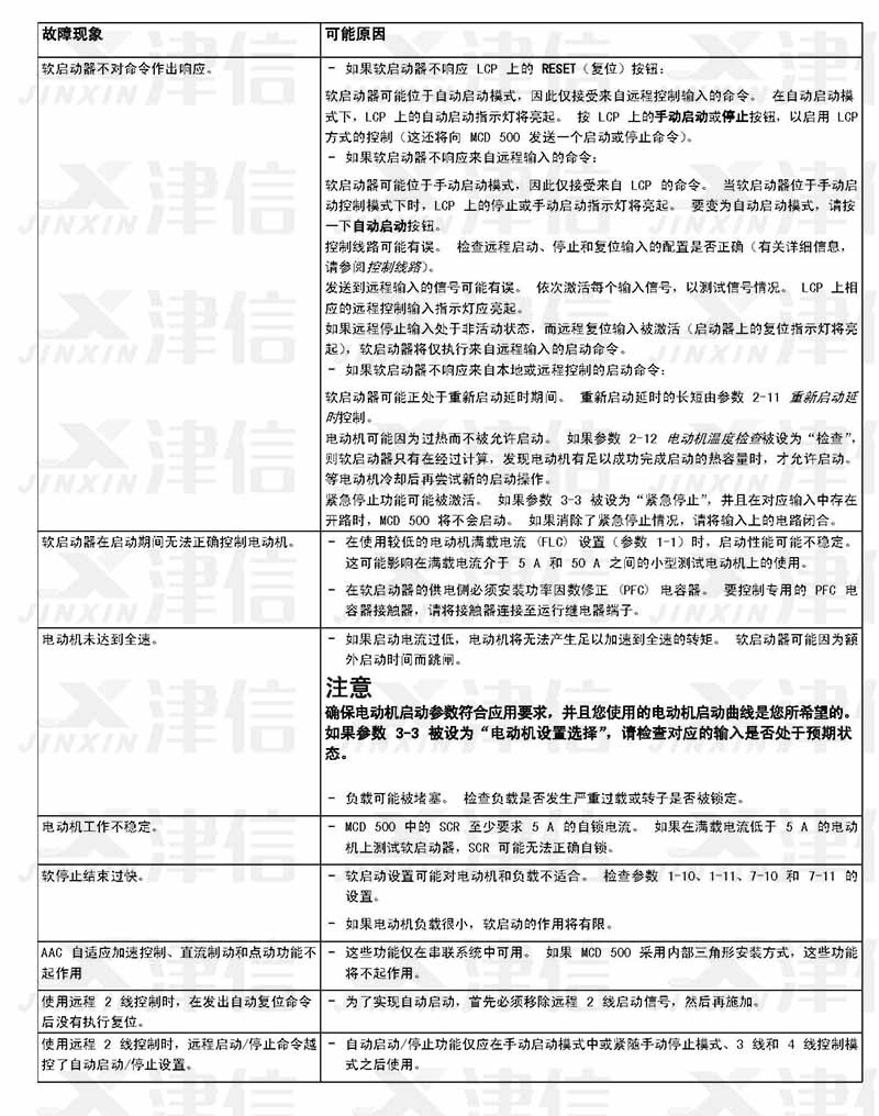 在軟啟動器使用過程中,如果偵測到故障信息,軟啟動器會在日志中記錄相關信息,還可能跳閘或發出警告。軟啟動器跳閘后,只有將該軟啟動器復位才能重新啟動。 如果發出警告,則一旦消除了警告原因,軟啟動器便會自動復位。
