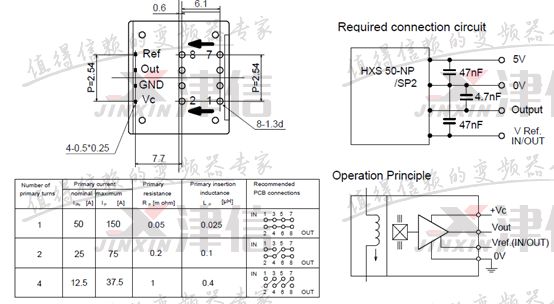 3、測量三相輸出電流檢測電路,查看電流傳感器型號為HXS 50-NP,測量輸入電源只有2.4V,而HXS 50-NP正常工作的輸入電源為5V。可以確定故障點在此。接線圖如下: