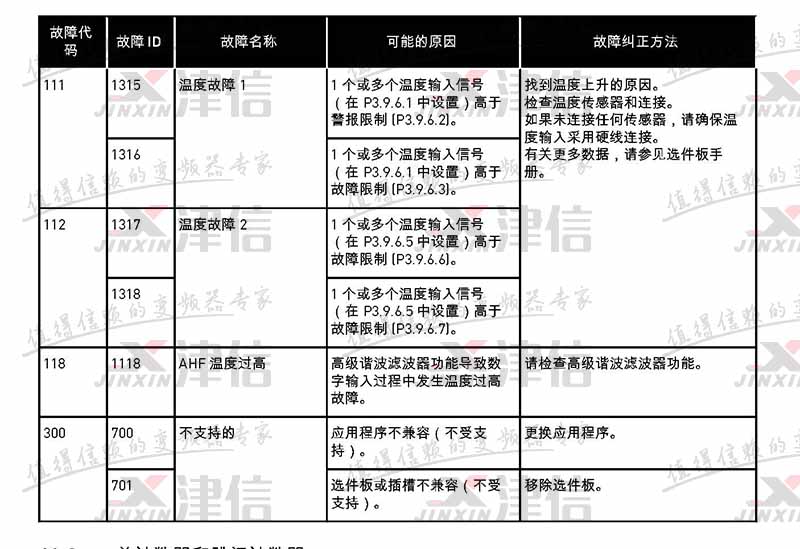 8 600 系統故障 控制板與電源之間無通信。 重置故障并重新啟動變頻器。