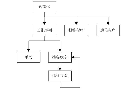 開機(jī)后,首先進(jìn)行通信和狀態(tài)的初始化。初始化完成后同時(shí)調(diào)用工作序列、報(bào)警和通信子程序。工作序列中,包含手動(dòng)和自動(dòng)兩種狀態(tài),自動(dòng)運(yùn)行又包括單次鋸切和連續(xù)鋸切兩種工作模式。報(bào)警程序用于對(duì)機(jī)器狀態(tài)進(jìn)行實(shí)時(shí)監(jiān)控,并根據(jù)故障情況執(zhí)行相關(guān)動(dòng)作。通信程序用于PLC和變頻器的FC協(xié)議通信,實(shí)現(xiàn)運(yùn)行狀態(tài)和報(bào)警信息的監(jiān)控。