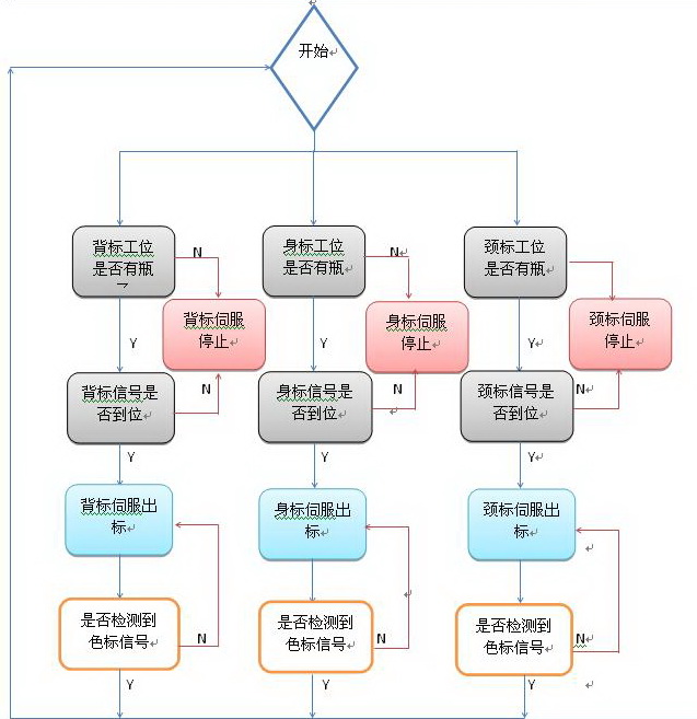 啤酒貼標(biāo)機(jī)由進(jìn)瓶傳送帶、主軸、出瓶傳送帶、貼標(biāo)伺服及各個(gè)位置傳感器組成。當(dāng)設(shè)備運(yùn)行時(shí),系統(tǒng)會(huì)檢測當(dāng)前貼標(biāo)工位是否有瓶子,如有,則對應(yīng)得貼標(biāo)伺服開始動(dòng)作。例如當(dāng)系統(tǒng)檢測到背標(biāo)工位上有瓶子,且貼標(biāo)有貼標(biāo)信號時(shí),則貼標(biāo)伺服開始動(dòng)作,由色標(biāo)檢測傳感器來結(jié)束貼標(biāo)動(dòng)作,身標(biāo)與頸標(biāo)動(dòng)作與背標(biāo)一致。