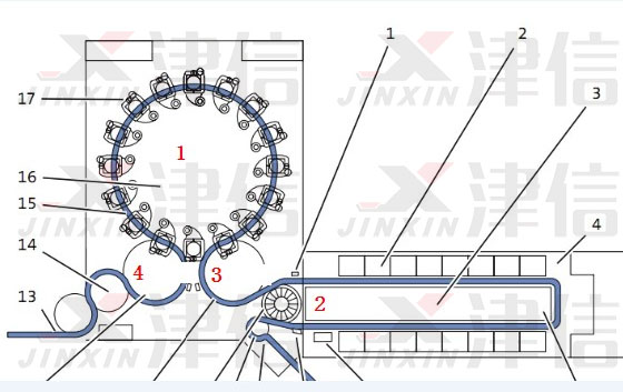 注:圖中機構1為吹塑站,2為加熱爐,3為取胚機械手,4為取瓶機械手;