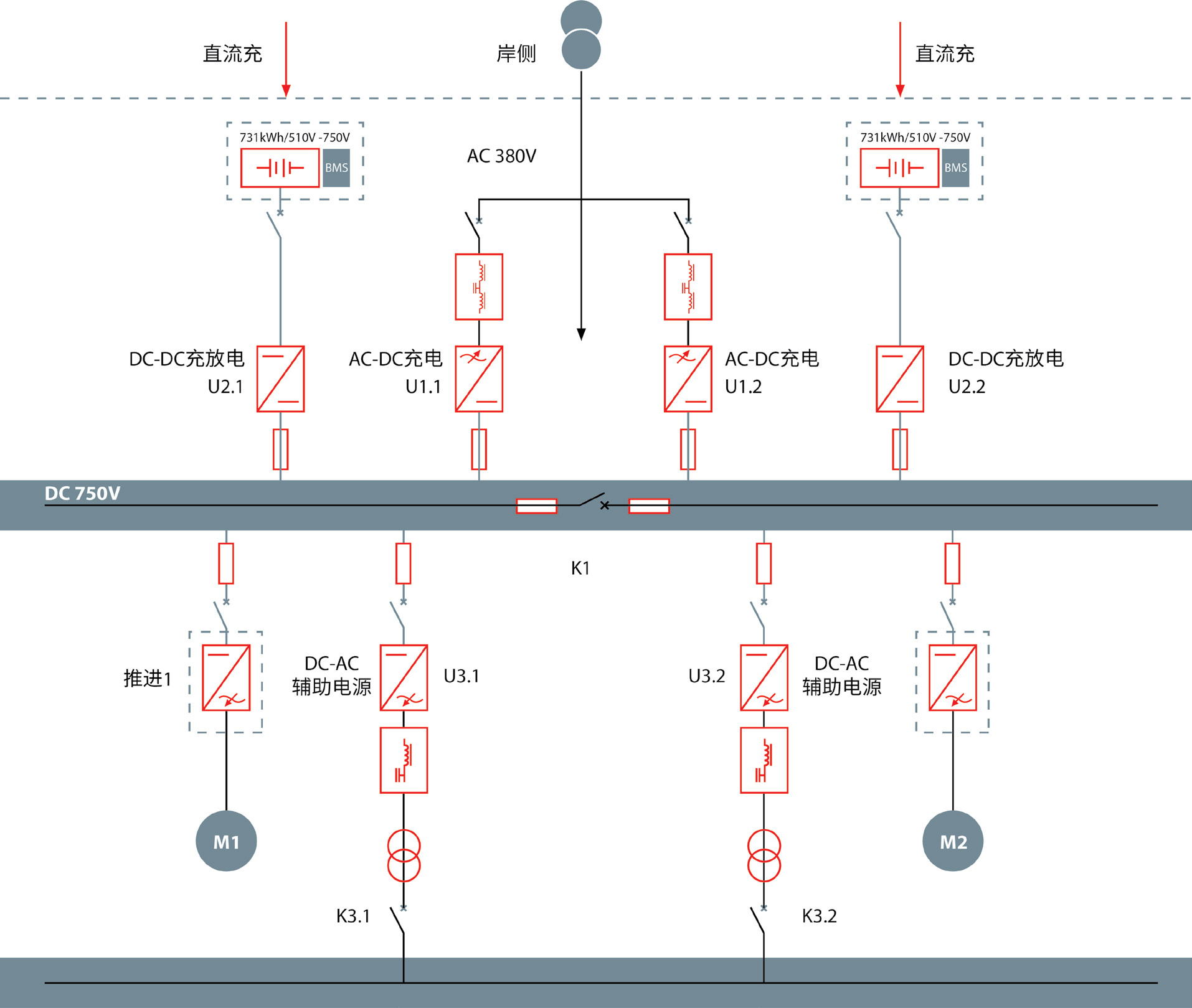 該船由中國最大的軌道交通電機電器生產(chǎn)企業(yè)-中國中車永濟電機有限公司整體研發(fā)制造,長江船舶設(shè)計院進行整船設(shè)計,整船在武昌船舶重工集團武昌基地制造并在各設(shè)備供應(yīng)商配合下進行制造、調(diào)試和試航。由于該船設(shè)計立項為國內(nèi)第一艘新能源純電動船,因此對整個系統(tǒng)的挑戰(zhàn)非常大,沒有任何可借鑒的經(jīng)驗,因此對整船動力系統(tǒng)、舵槳系統(tǒng)、推進系統(tǒng)、配電系統(tǒng)、輔助系統(tǒng)及網(wǎng)絡(luò)通訊系統(tǒng)提出了非常高的要求;最值得一提是該項目中使用的是新型直流配電系統(tǒng),更具有電能調(diào)節(jié)方便、節(jié)能提效、模塊化、智能化特點,諸多優(yōu)勢使其成為船舶領(lǐng)域的新興技術(shù);但相比于傳統(tǒng)的交流配電系統(tǒng)對該種配電方式也面臨諸多技術(shù)瓶頸。因此對變頻電源等核心元器件帶來巨大的挑戰(zhàn),丹佛斯傳動憑借產(chǎn)品的優(yōu)越的性能及穩(wěn)定的質(zhì)量打動了制造商及使用者,對動力系統(tǒng)、推進系統(tǒng)、配電系統(tǒng)及輔助系統(tǒng)進行了強有力的支持。