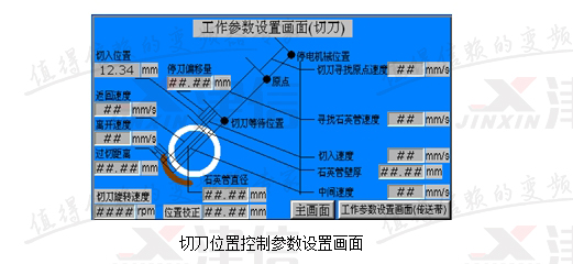 石英切割機(jī)有三個(gè)控制部分構(gòu)成:切刀旋轉(zhuǎn)控制、切刀位置控制和送料位置控制。切刀旋轉(zhuǎn)控制只要速度可調(diào)即可;切刀位置控制需要在切割石英管或石英棒的過(guò)程中控制其位置和不同段內(nèi)的速度,首先要保證切割產(chǎn)品的刀口質(zhì)量,同時(shí)要提高生產(chǎn)效率;送料位置控制需要每次往前送設(shè)定長(zhǎng)度的石英管或石英棒,精度要求0.2毫米。