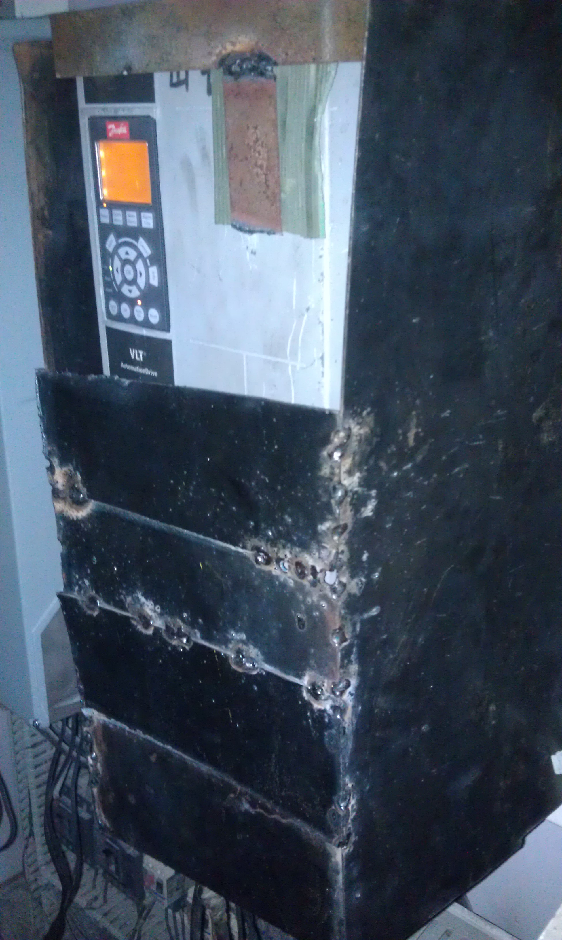 最后通過以上分析,現場服務工程師決定對新變頻器做一個磁場屏蔽的實驗,做一個鐵的環形屏蔽,如圖所示,設備重啟后馬上就運行正常了,并且連續運行了16個小時,期間無任何故障報警,一切運轉正常。